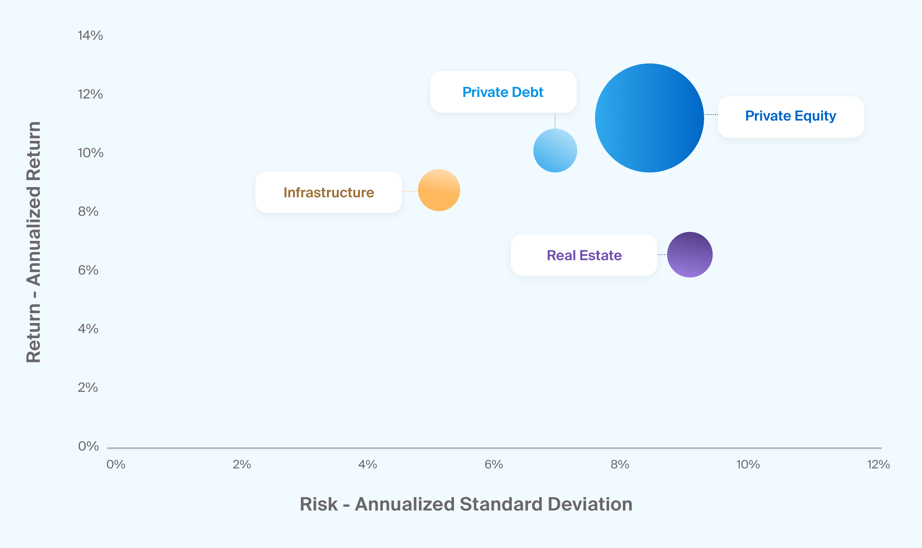 Source: Preqin, return represented by annualized return, risk represented by annualized risk, calculated between 12-2000 and 9-2024, the size of each circle represents the assets under management (AUM) for funds in each category, as of 6-2024