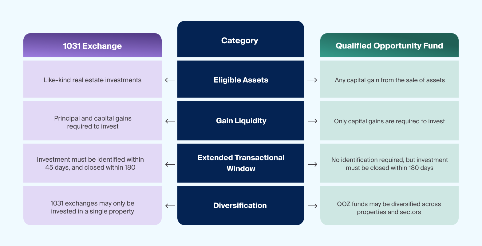 Investors may be curious how the QOZ strategy compares to other tax incentivized real estate strategies like 1031s. Unlike a 1031 Exchange, which requires investing in like-kind property to defer gains, QOZ funds allow investors to invest in a more diverse set of assets. Here are some potential advantages of QOZ funds compared to 1031 exchanges5: