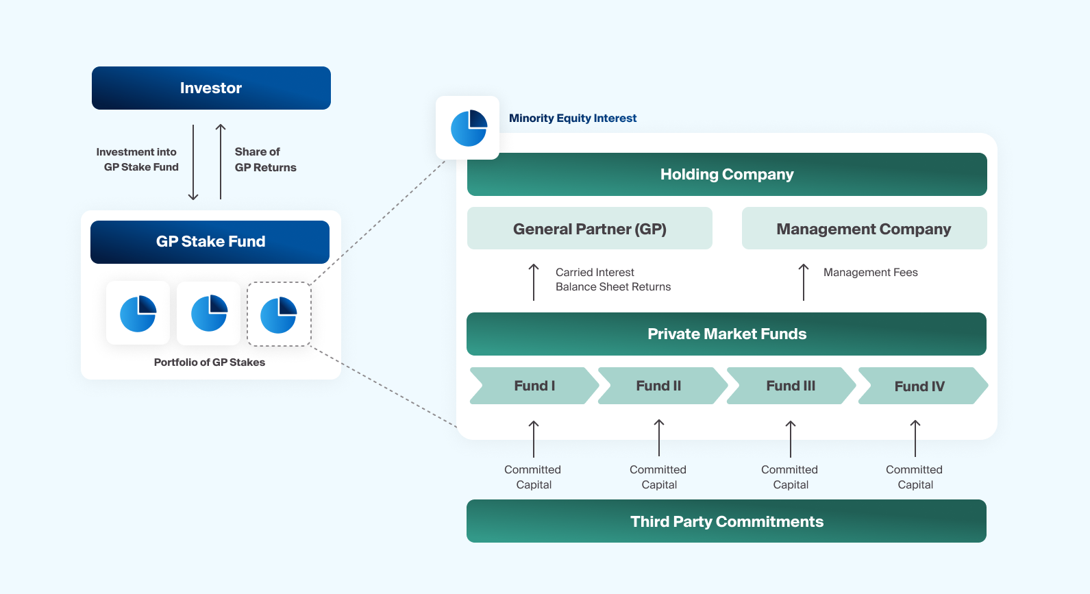 GP stakes involve the acquisition of minority equity interests in the management companies of established private market alternative asset managers.2 This investment approach allows investors to secure an investment in a piece of the private asset management industry without taking on a controlling role.