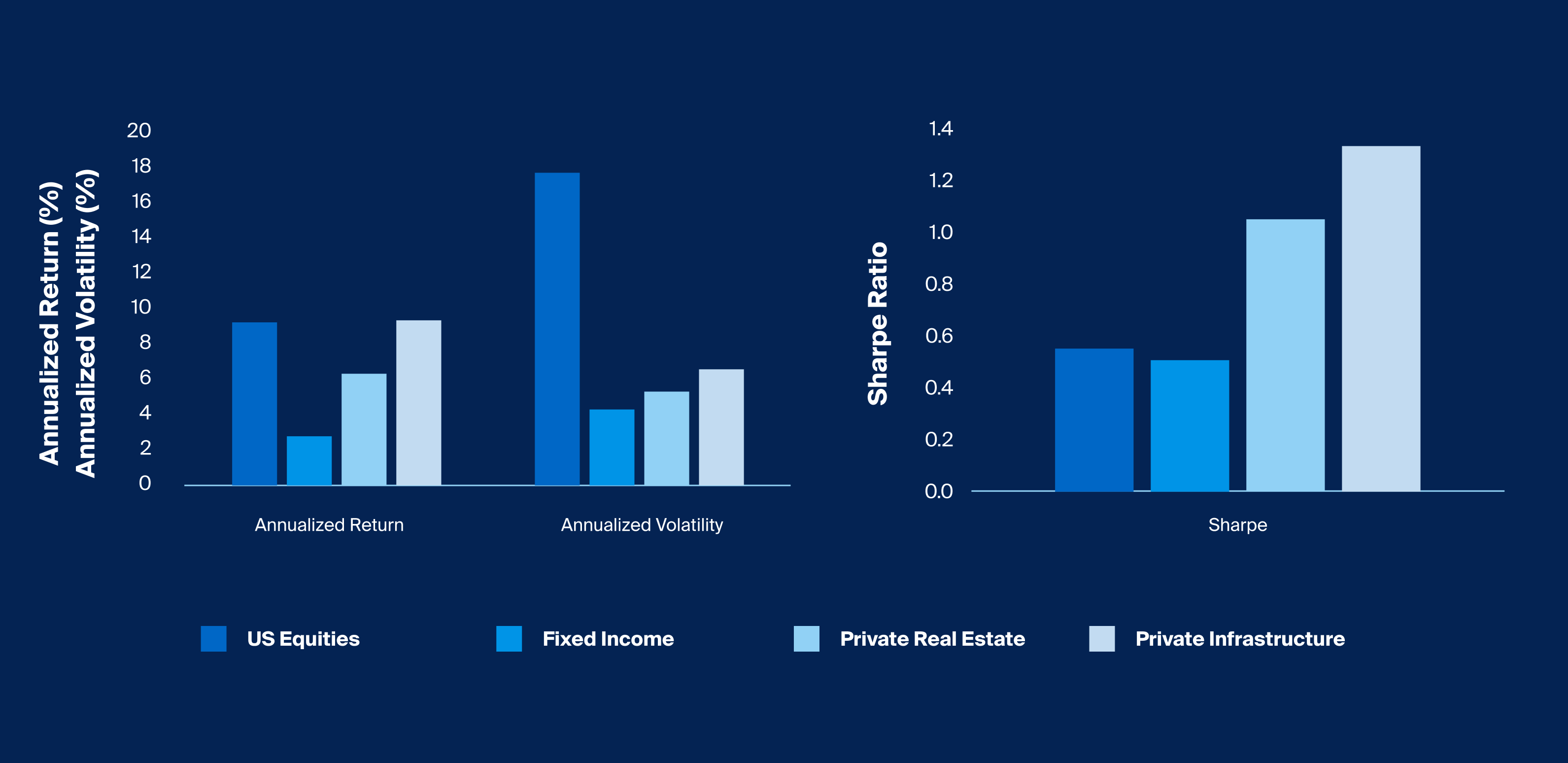As we note in our introductory piece, with attributes like long-term contracts and relatively predictable cash flows, infrastructure assets have presented potential benefits for investors. But how has private infrastructure, as an asset class, actually performed compared to more traditional asset classes, like bonds and equities, or its real-asset counterpart, private real estate?