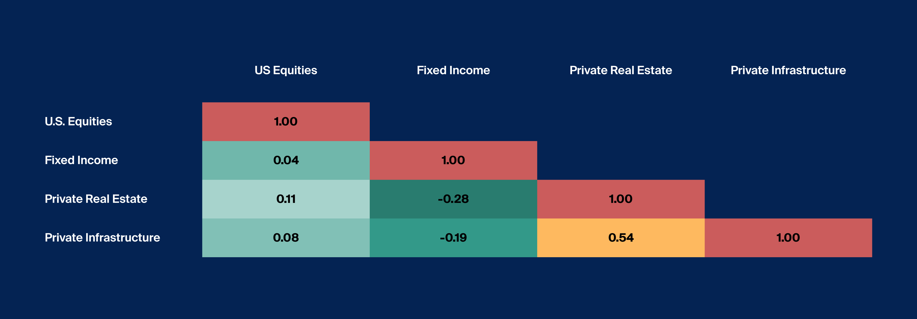 Private infrastructure funds, in aggregate, have demonstrated a low correlation to public equities and fixed income, while maintaining a moderate correlation to private real estate. They also had smaller drawdowns than public equities, perhaps most significantly following the 2022 Fed rate hikes.
