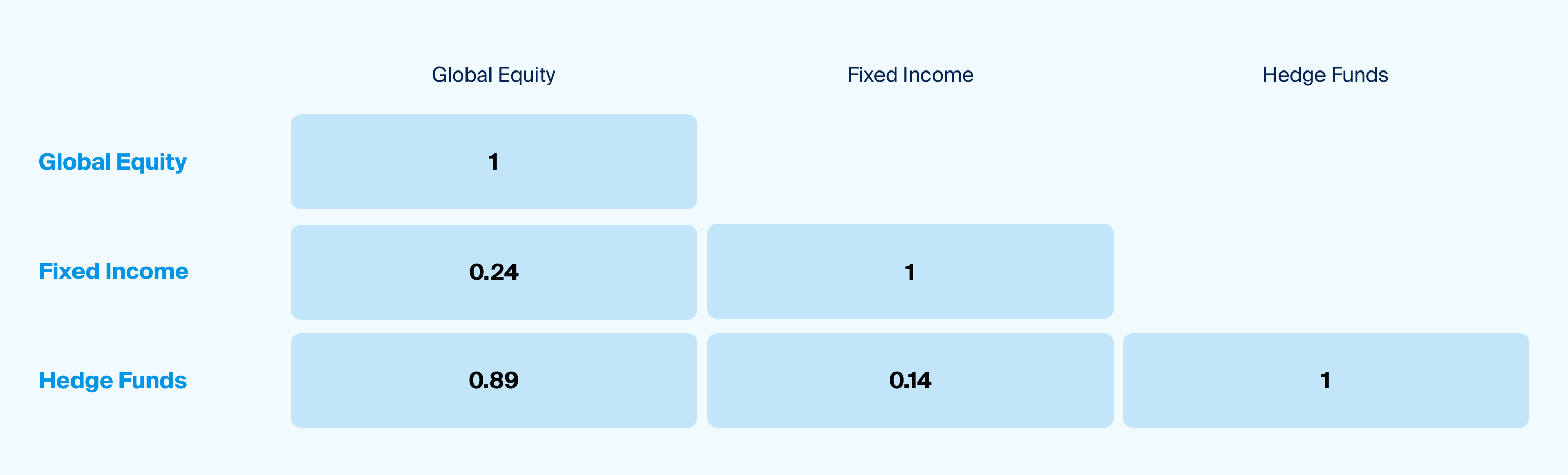 Source: Bloomberg; Global Equity represented by the MSCI ACWI Net Total Return Index, Fixed Income represented by the Bloomberg Barclays US Aggregate Bond Index, 60/40 Portfolio represented by 60% allocation to Global Equity and 40% allocation to Fixed Income, HFR; Hedge Funds represented by the HFRI Hedge Fund Composite Index, Venn; for calculations, as of December 2023. Return is the annualized return and risk is the annualized standard deviation. Past performance is no guarantee of future results. This graphic does not predict or project performance or imply that past performance will recur.