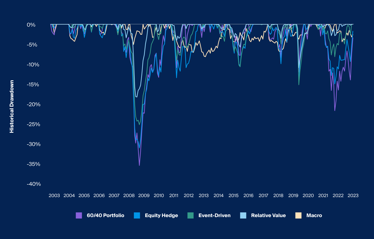 Through the lens of historical drawdown, a well-traveled measure of assessing the downside protection and risk mitigation of investments, we can analyze the variation of performance across strategies in practice. Some strategies, such as Macro would have historically been more equipped to preserve capital while others like Event-Driven and Equity Hedge appear to have followed more closely the fluctuations of traditional indices and the 60/40 portfolio which contain them.