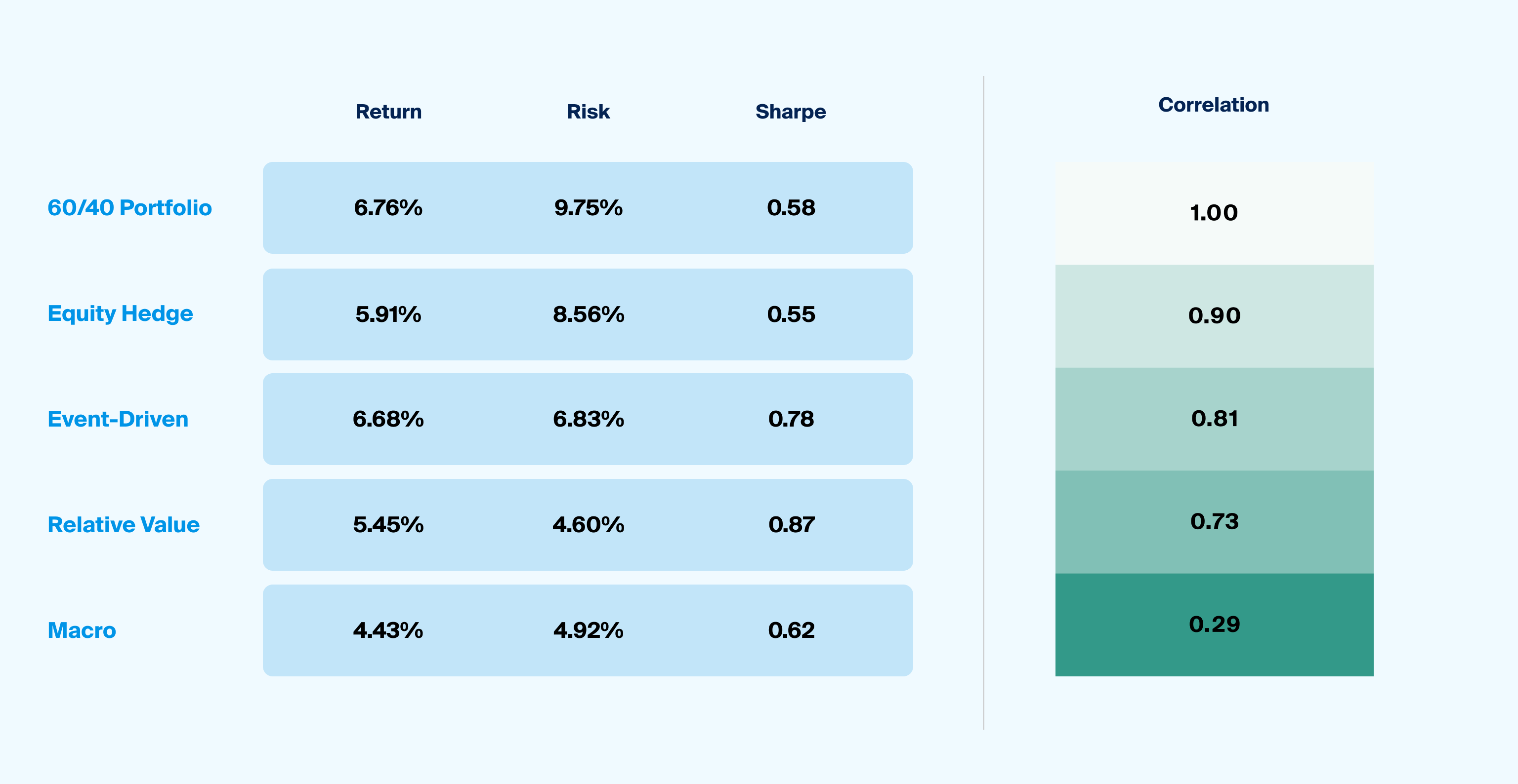 Source: Bloomberg; 60/40 Portfolio represented by 60% allocation to the MSCI ACWI Net Total Return Index and 40% allocation to the Bloomberg Barclays US Aggregate Bond Index, HFR; Equity Hedge represented by the HFRI Equity Hedge (Total) Index, Event-Driven represented by the HFRI Event-Driven (Total) Index, Relative Value represented by the HFRI Relative Value (Total) Index, Macro represented by the HFRI Macro (Total) Index, Venn; for calculations, as of December 2023. Return is the annualized return and risk is the annualized standard deviation. Past performance is no guarantee of future results. This graphic does not predict or project performance or imply that past performance will recur.