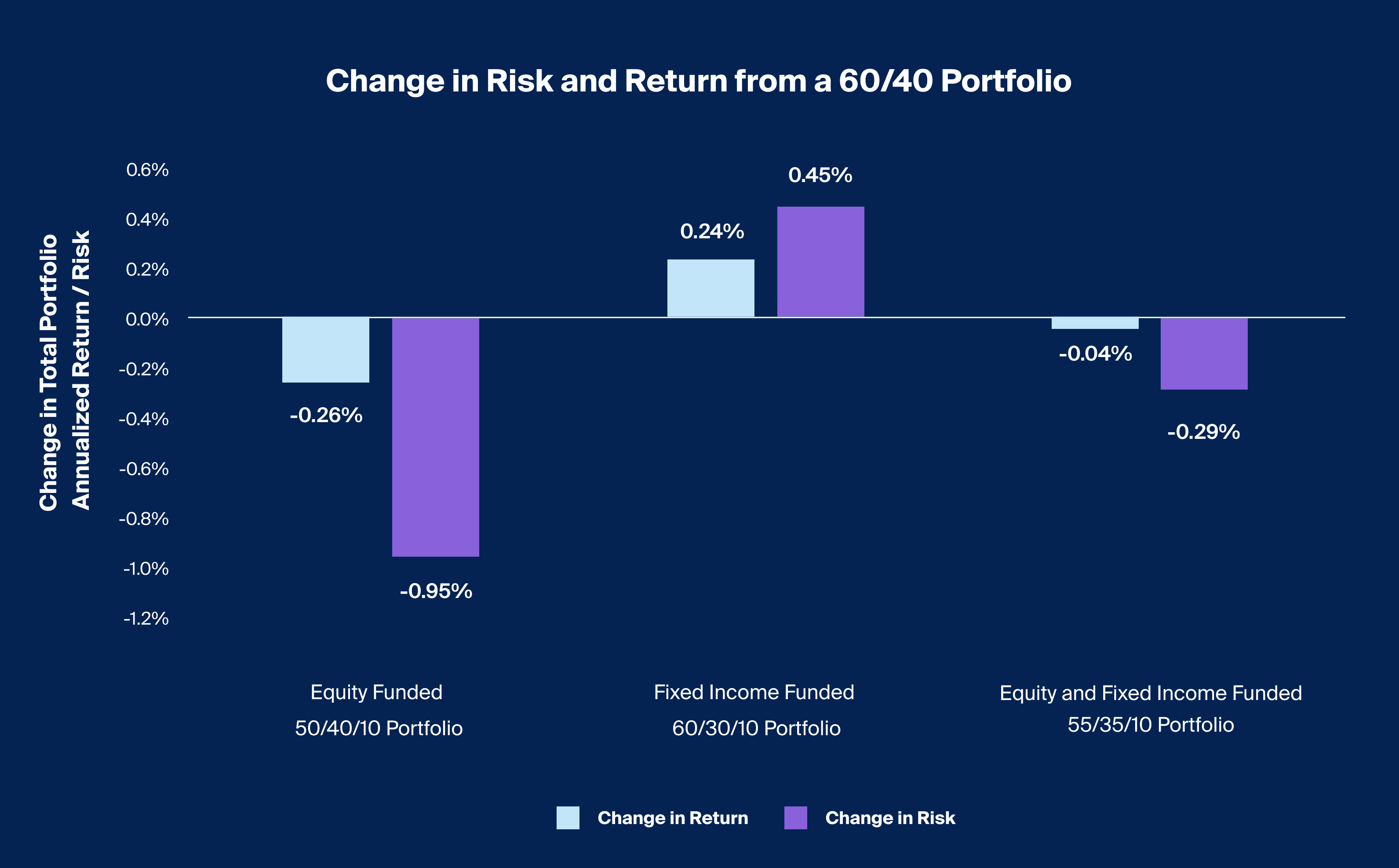 In a traditional 60/40 portfolio, and based on our historical analysis over the past 20 years, funding an allocation to hedge funds with equity may have minimized portfolio risk, represented by annualized standard deviation, but at the cost of return, represented by annualized return. Conversely, funding through fixed income appears to have increased return, but at the cost of an increase in risk.However, past performance is no guarantee of future results.