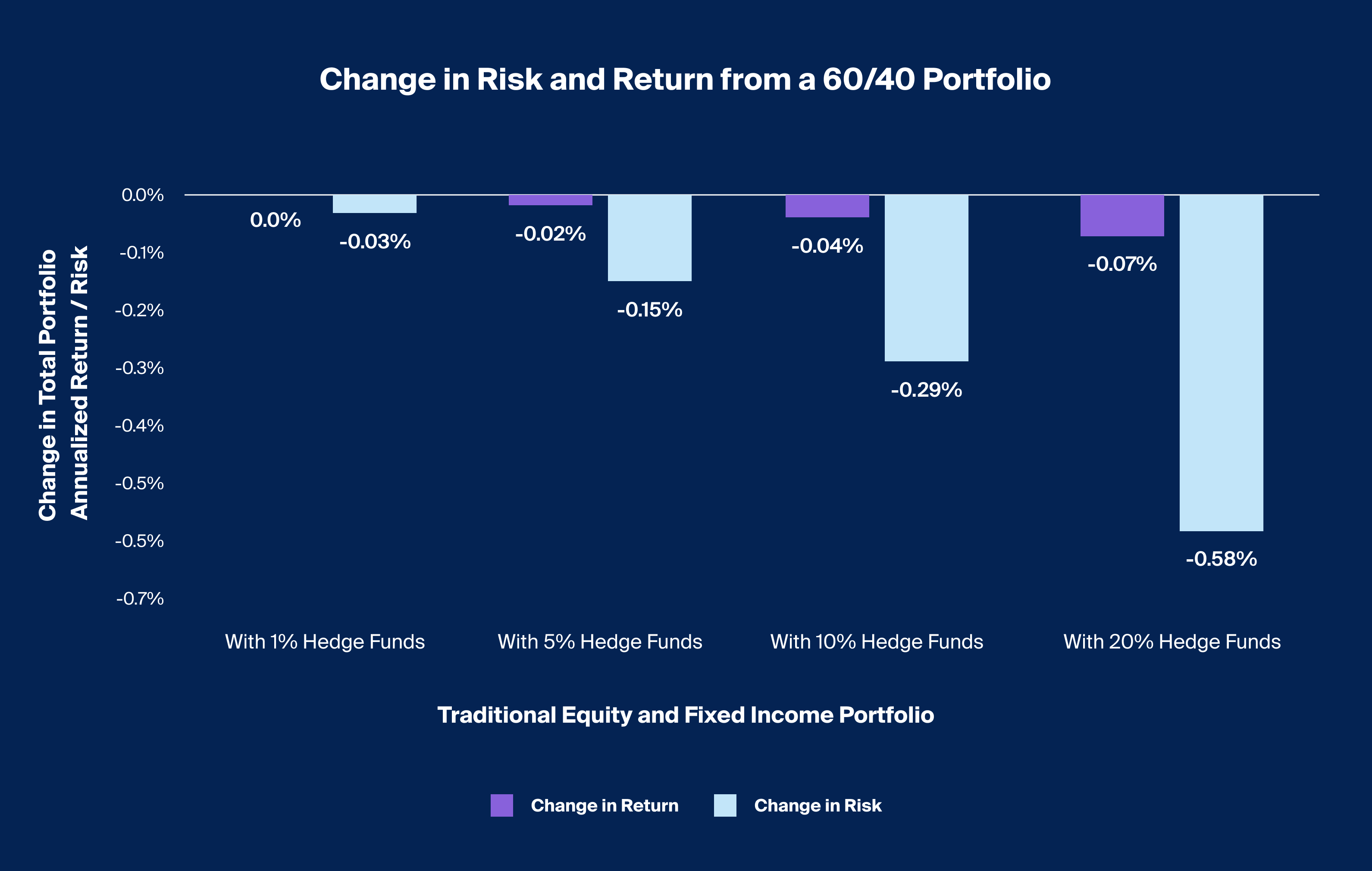 Source: Bloomberg; 60/40 Portfolio represented by 60% allocation to the MSCI ACWI Net Total Return Index and 40% allocation to the Bloomberg Barclays US Aggregate Bond Index, HFR; each allocation to Hedge Funds represented by the HFRI Hedge Fund Composite Index, funded equally between Equity and Fixed Income, Venn; for calculations, as of December 2023. Return is the annualized return and risk is the annualized standard deviation. Past performance is no guarantee of future results. This graphic does not predict or project performance or imply that past performance will recur.