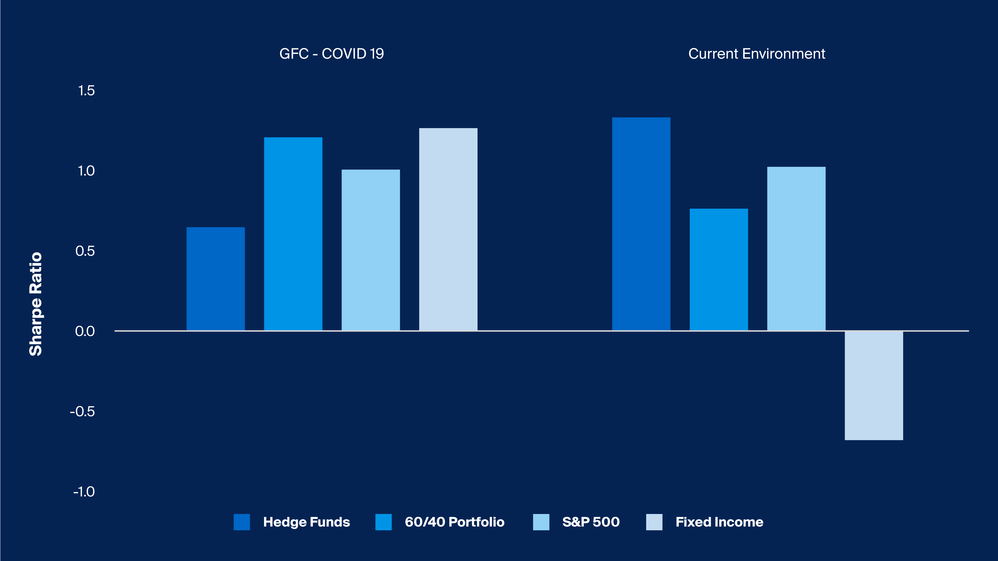 Source: Venn, HFRI, Hedge Funds represented by HFRI Fund Weighted Composite Index, Bloomberg, S&P 500 represented by S&P 500 Index, Fixed Income represented by Bloomberg Barclays US Aggregate Bond Index, 60/40 portfolio represented by 60% weighting to S&P 500 and 40% weighting to Fixed Income, GFC – Covid-19 period measures performance between March 2009 and March 2020, Current Environment period measures performance between April 2020 and July 2023, as of July 2023.