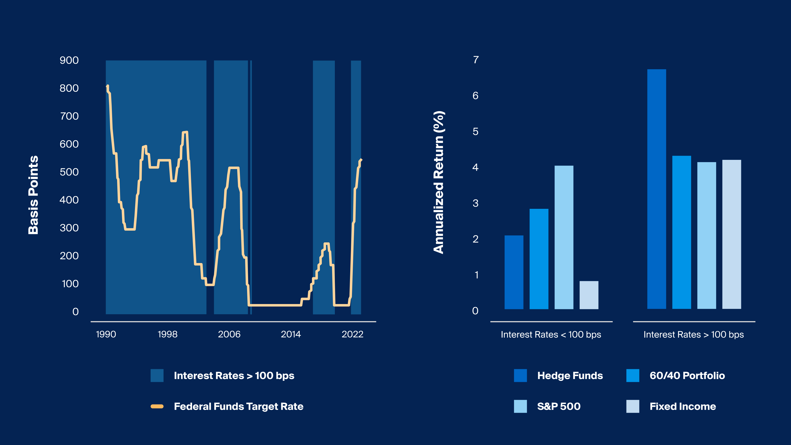 Source: HFRI, Hedge Funds represented by HFRI Fund Weighted Composite Index, Bloomberg, S&P 500 represented by S&P 500 Index, Fixed Income represented by Bloomberg Barclays US Aggregate Bond Index, 60/40 portfolio represented by 60% weighting to S&P 500 and 40% weighting to Fixed Income, Interest Rates represented by Federal Funds Target Rate Upper Bound Index, as of July 2023.