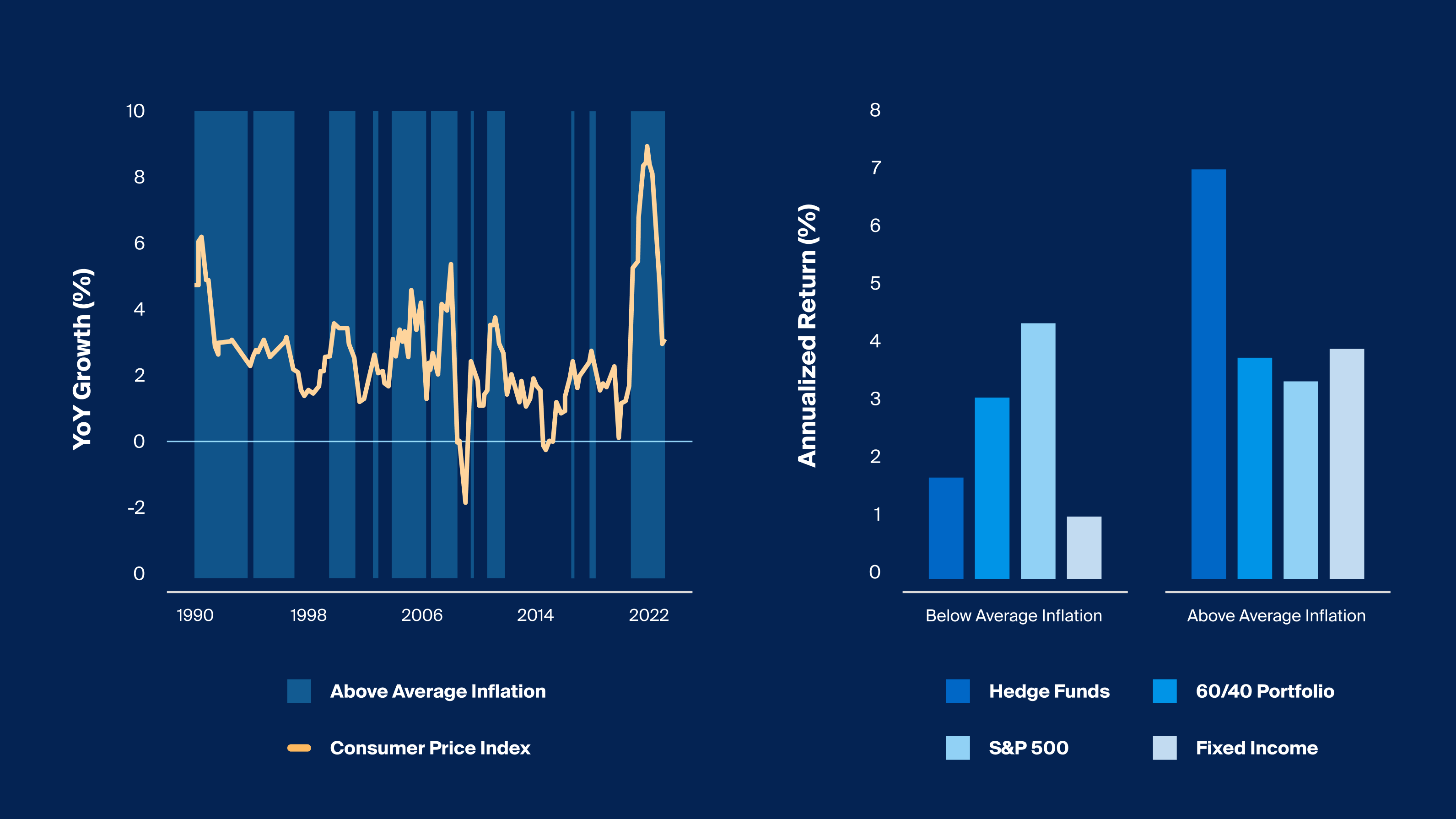 Since 1990, across periods of above-average inflation, hedge funds have generated an annualized net return far in excess of public equities and traditional fixed income.