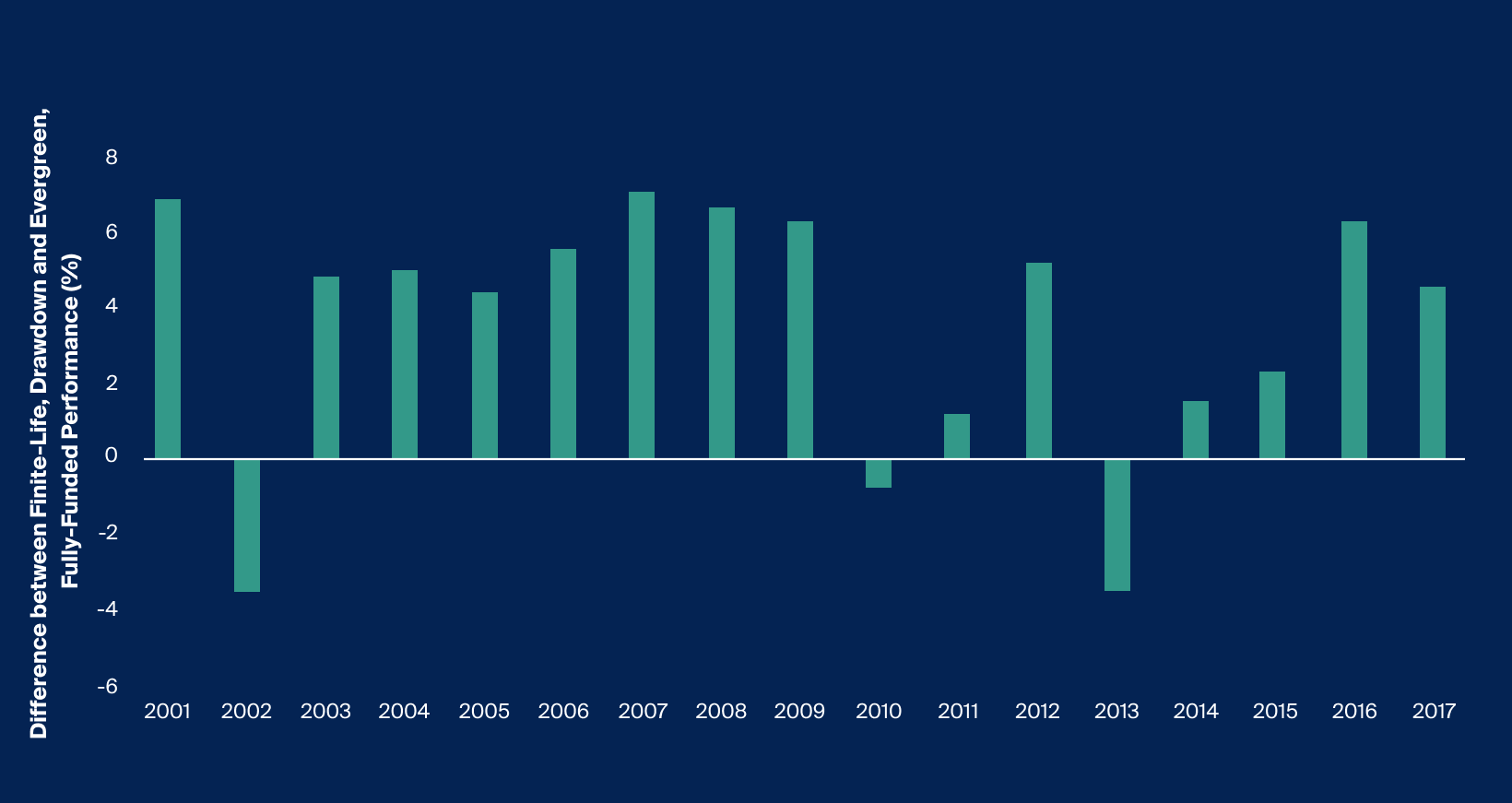 Given the impact of timing both at entry and exit on the ultimate performance for drawdown funds, we compare ultimate finite-life drawdown fund returns with the 5-year annualized return of evergreen fully funded funds assuming deployment in the same year to compare performance across these two different fund structures.