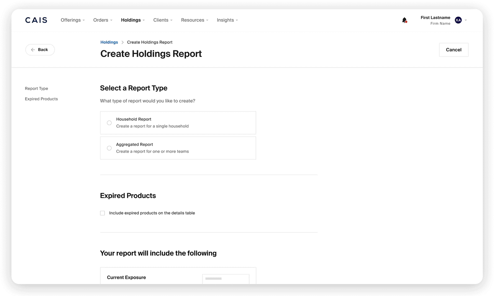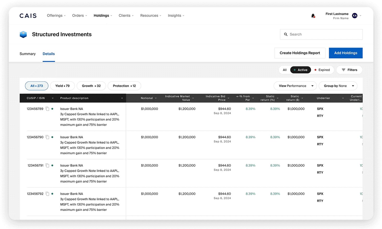 Use the holdings report tool to review and oversee your structured notes business more efficiently. This platform update enables you to create reports regarding individual households or your entire book of business. You can customize reports to better monitor exposure across issuers, underliers, structures, and time to maturity.