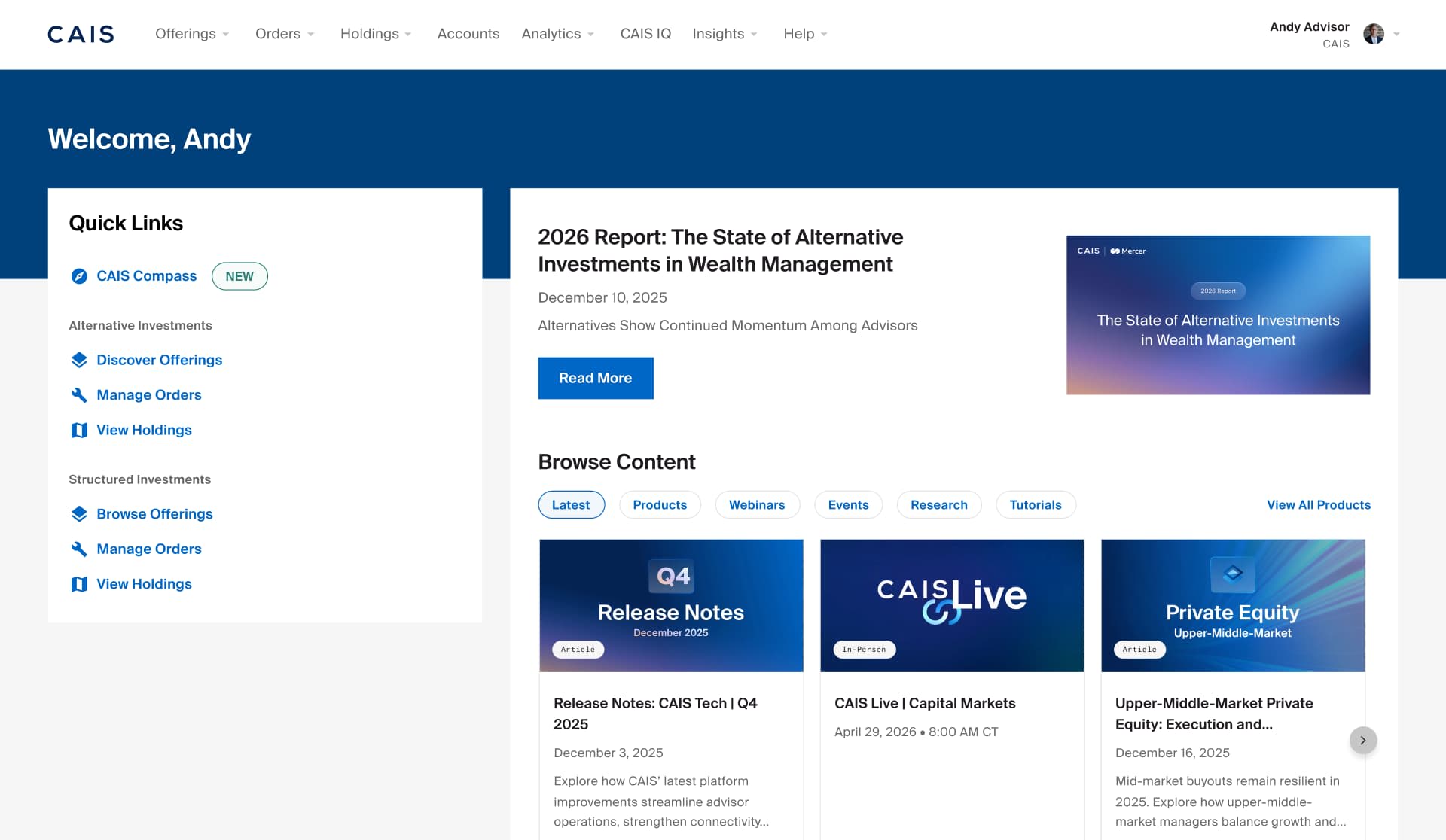 Through the CAIS platform, advisors can explore strategies across private debt, private equity, real estate, infrastructure, hedge funds, and more.